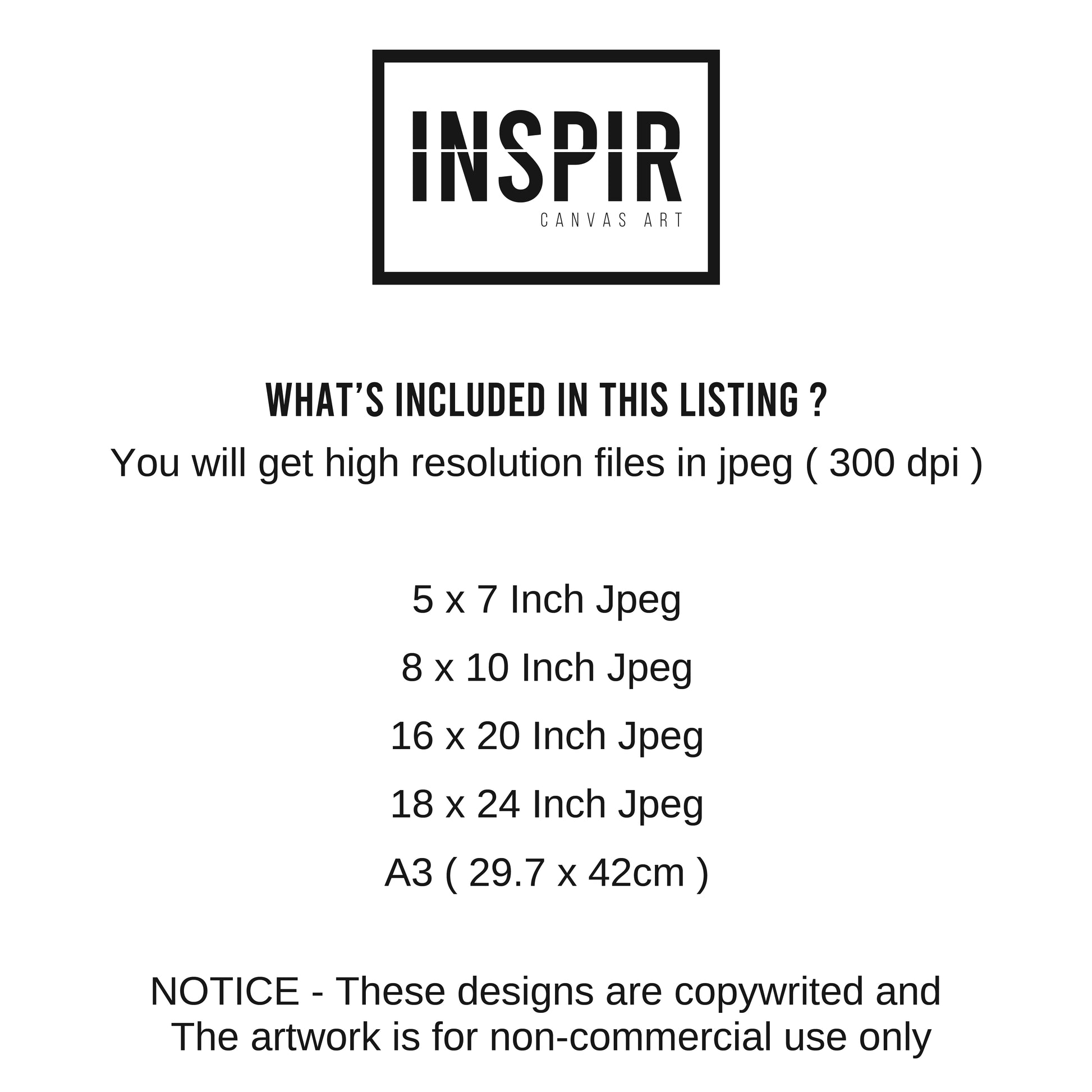 You will receive your artwork in high resolution ( 300 dpi ) files, in 5 different sizes