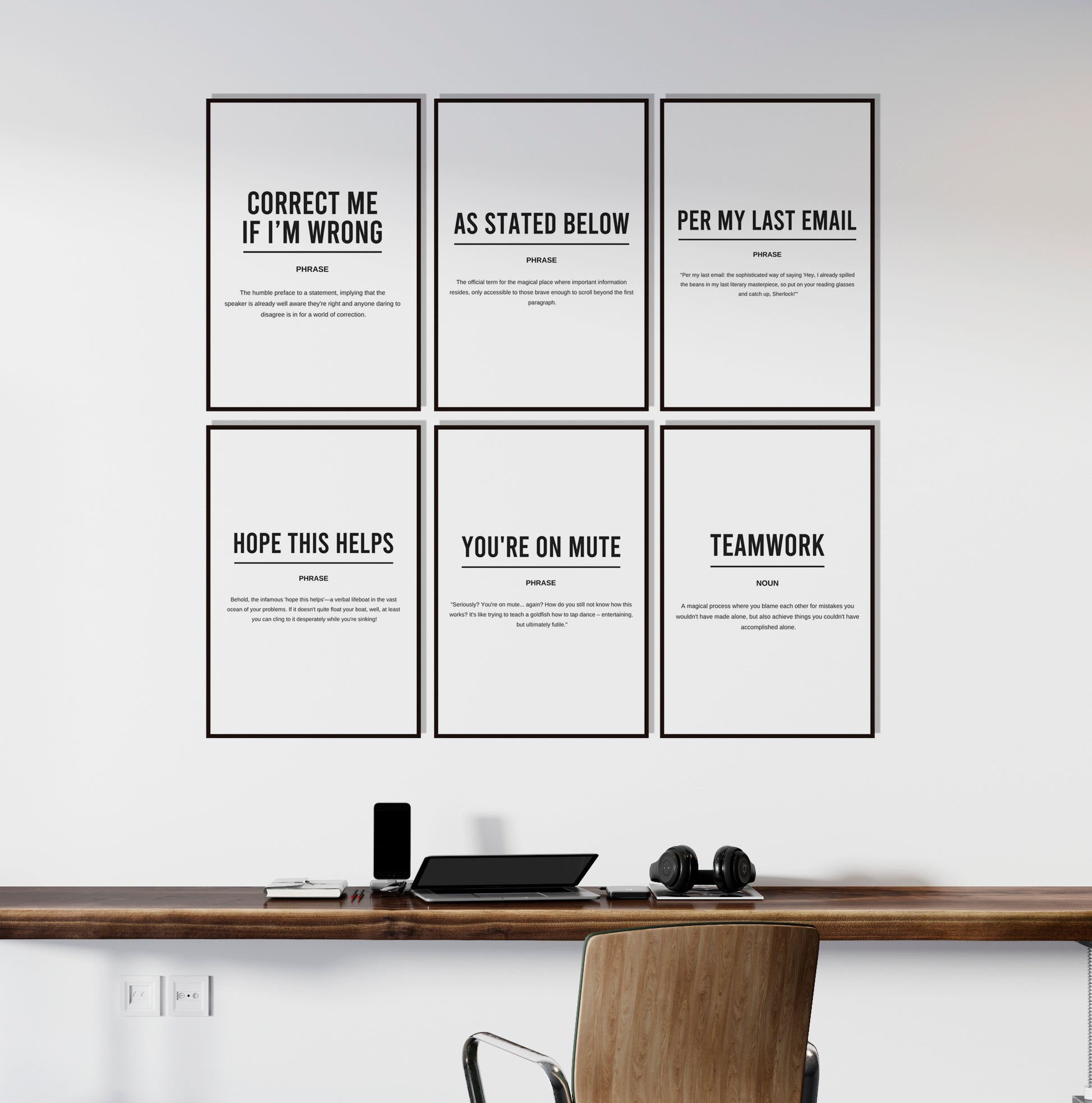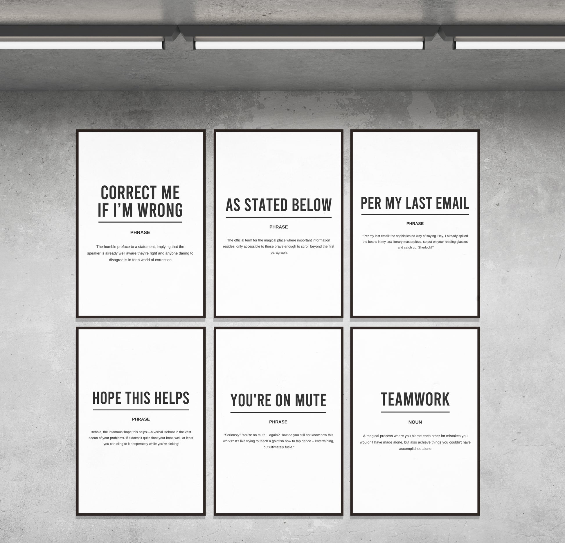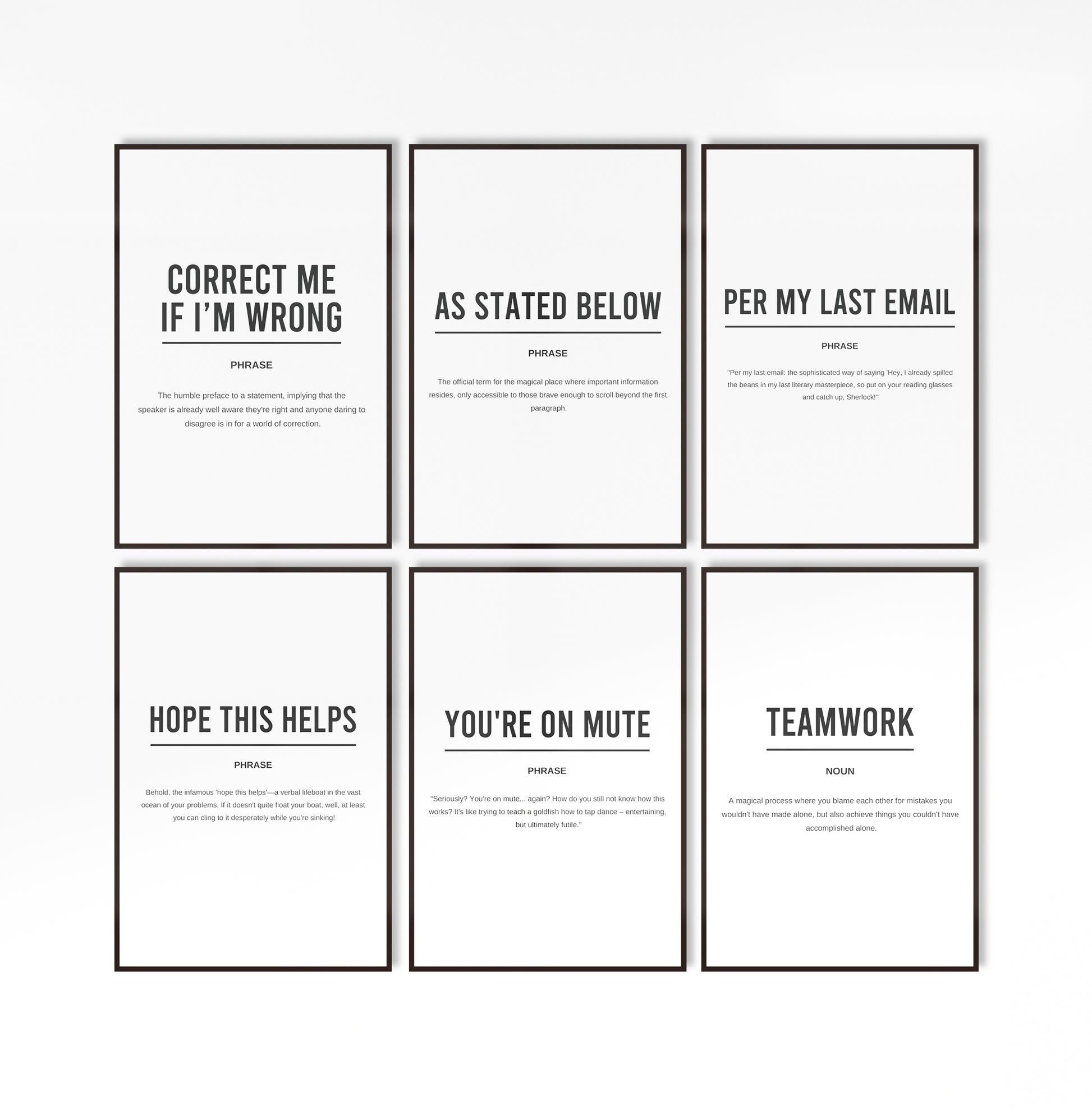 Digital download of printable set of 6 definition motivational posters including "Correct me if i'm wrong" "As stated below" "Per my last email " "Hope this helps " "You're on mute" and "Teamwork"