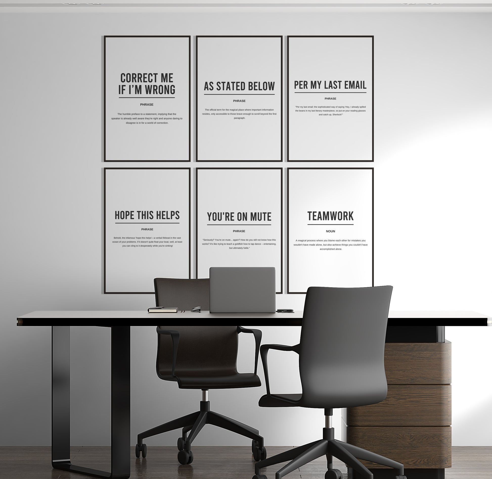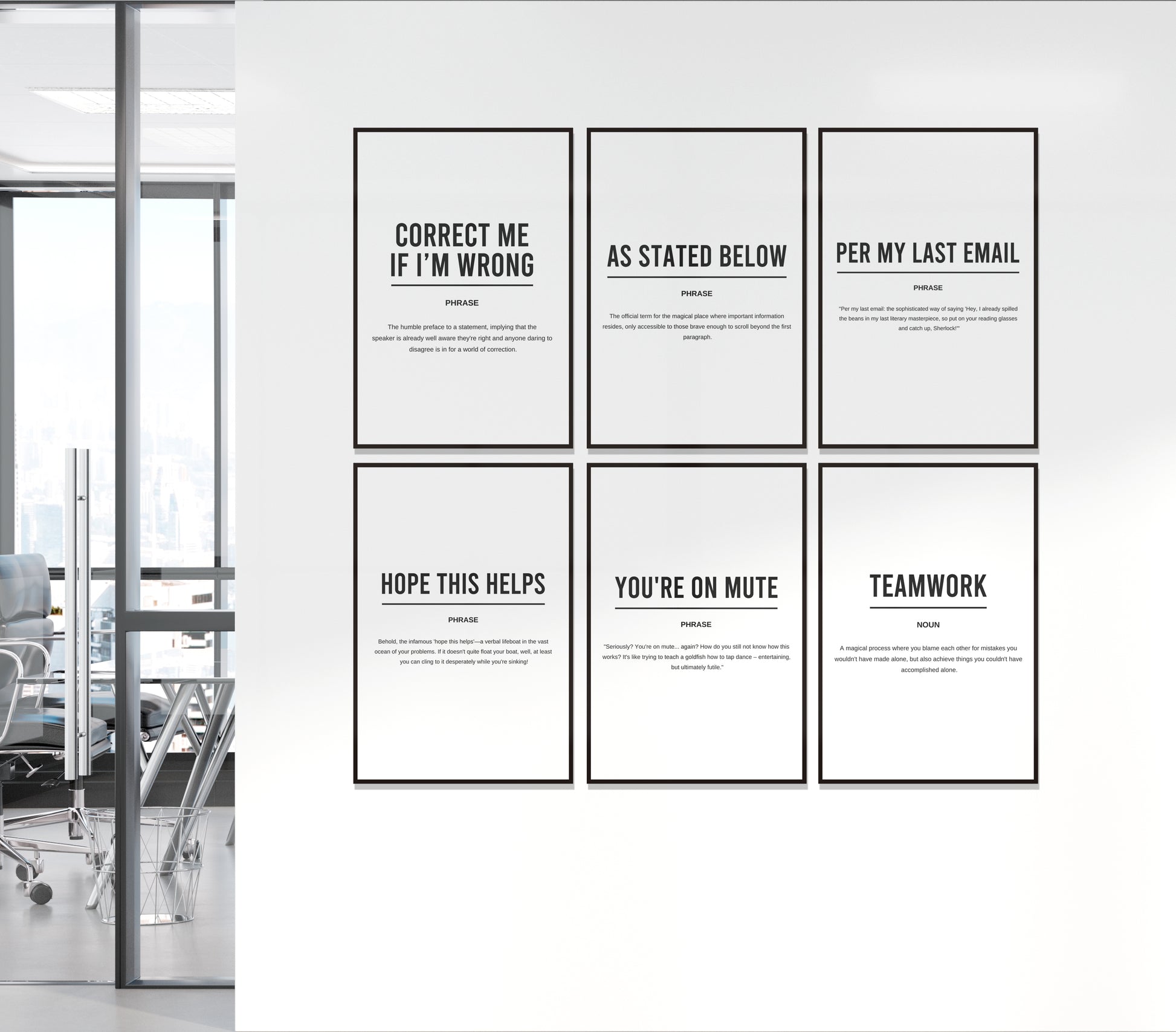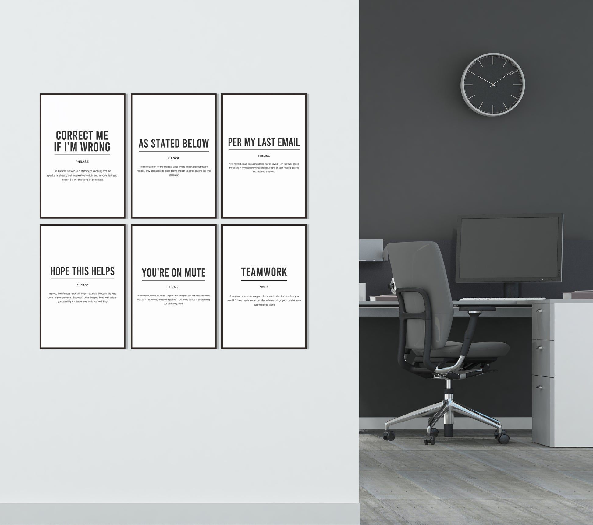 Digital download of printable set of 6 definition motivational posters including "Correct me if i'm wrong" "As stated below" "Per my last email " "Hope this helps " "You're on mute" and "Teamwork"