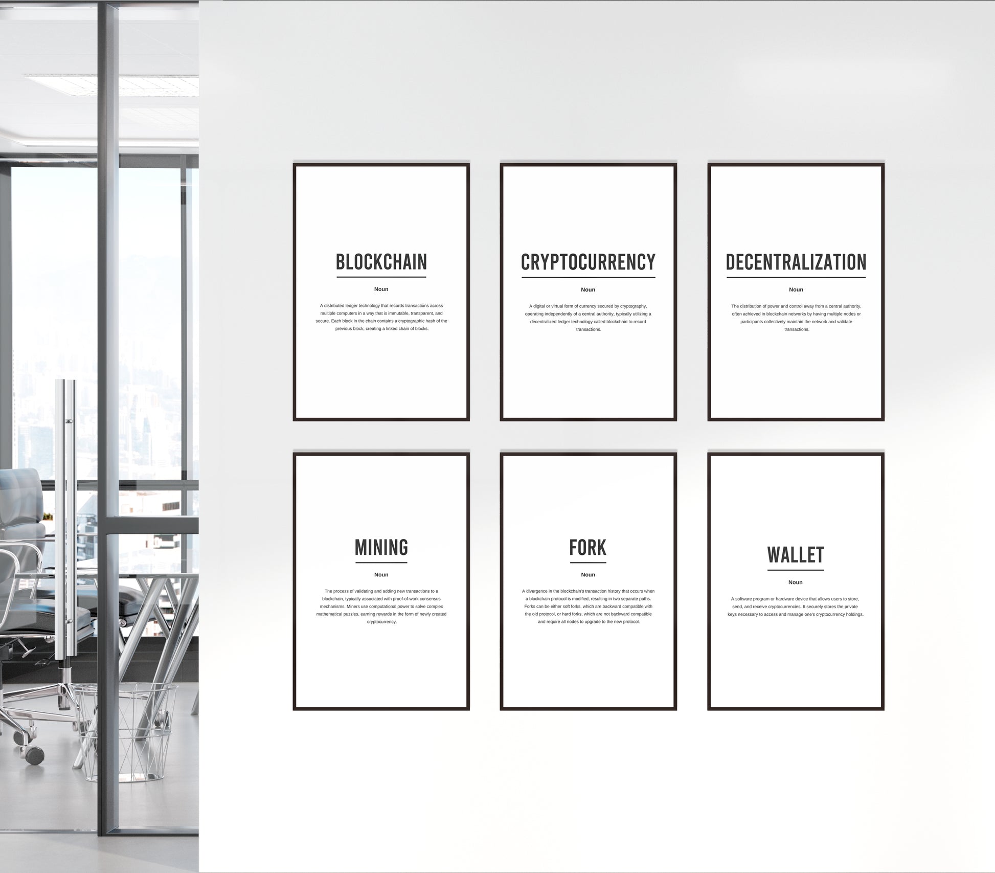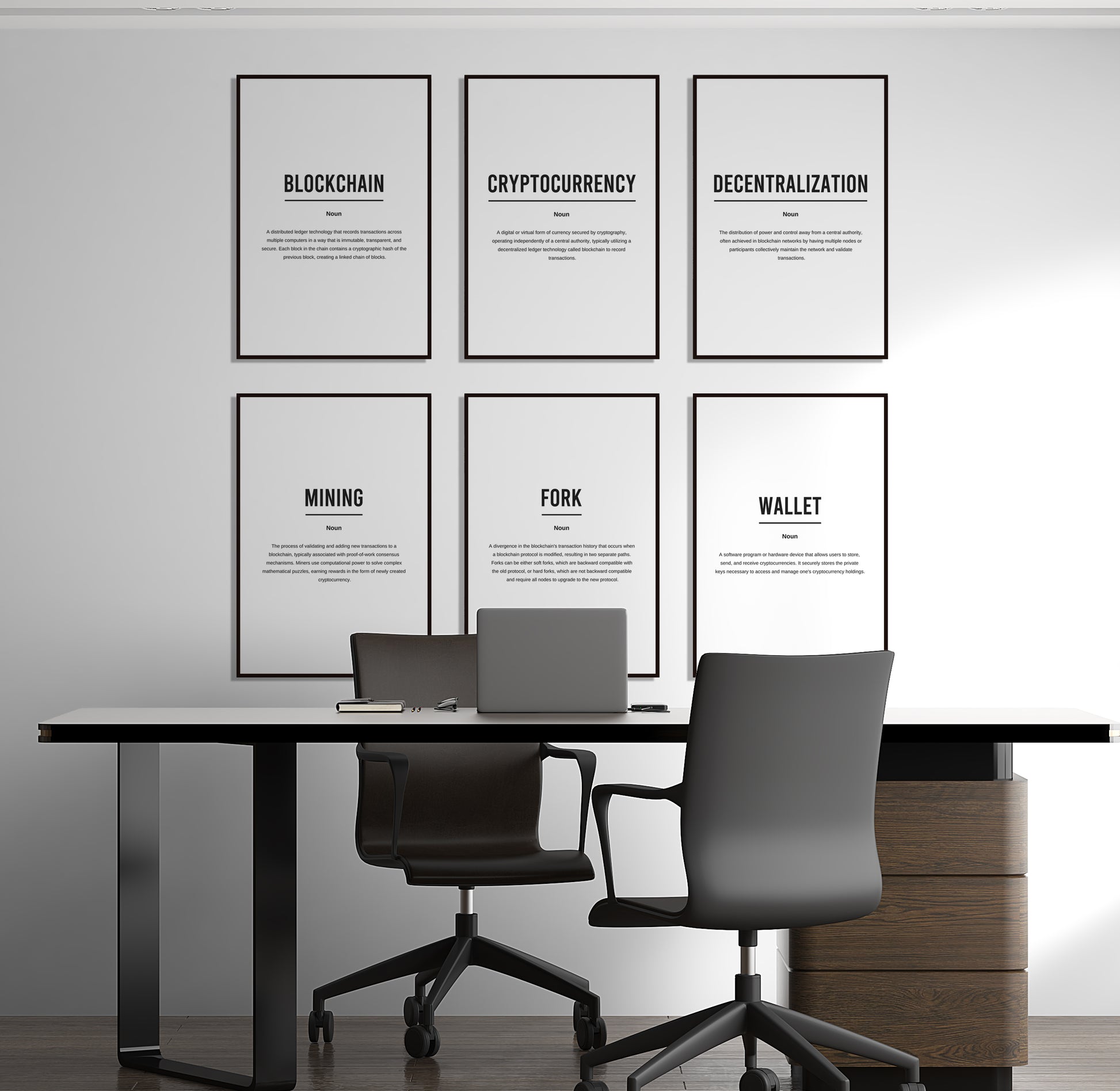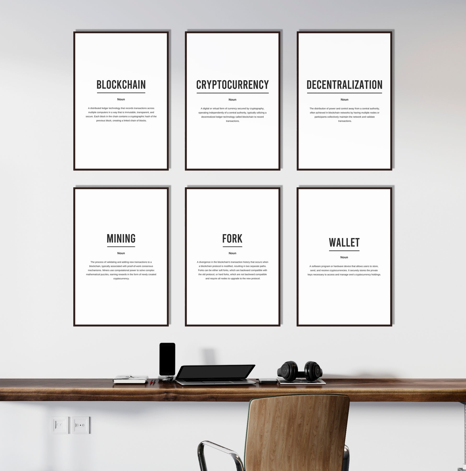 This set of 6 Cryptocurrency definition prints are a great way to decorate your home or office. When grouped together on a wall they give instant impact and really lift the appearance of a boring office space.